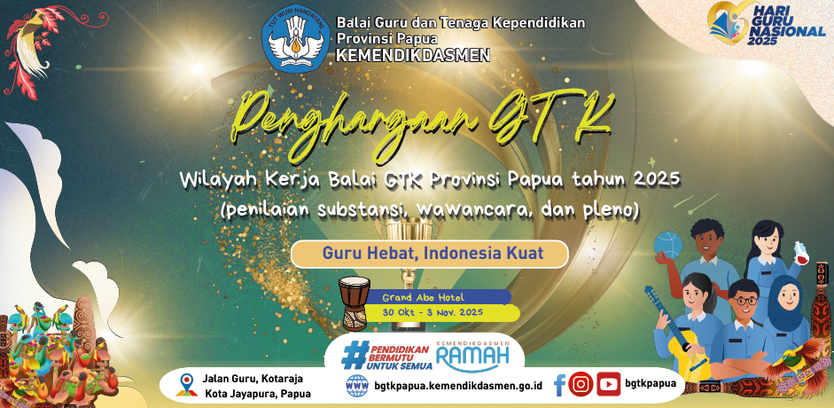 Jayapura (30/10) – Dalam rangka memperingati Hari Guru Nasional (HGN) yang jatuh pada 25 November, Kementerian Pendidikan Dasar dan Menengah (Kemendikdasmen) melalui Balai Guru dan Tenaga Kependidikan (BGTK) Provinsi Papua menggelar apresiasi GTK tahun 2025. Kegiatan ini dilaksanakan sebagai bentuk apresiasi atas pengabdian dan dedikasi dari guru dan tenaga kependidikan di empat provinsi, yaitu Provinsi […]